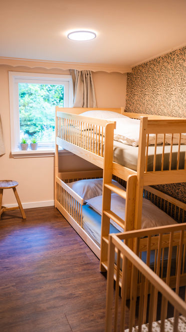 Tweede slaapkamer met een lekker stapelbed (90 cm breed, ook geschikt voor volwassenen) en een mooi ledikantje voor de allerkleinste.